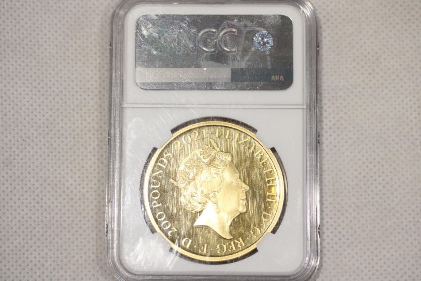 2021 £200 gold proof coin. 2 troy Oz. .999/24ct gold. Very limited edition of 350 worldwide. 40mm Diameter. PF 70 ultra cameo. The Great British engravers 2021 £200 Gothic Crown Rev. Graded by NGC This is not available for viewing, it is not left at the auction rooms.