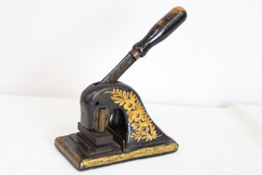 A Victorian or Edwardian 1870-1910 cast iron desk paper embosser/stamp with hand painted floral design. ‘WOODHEAD,BURLEY-IN-WHARFEDALE,YORKS.’