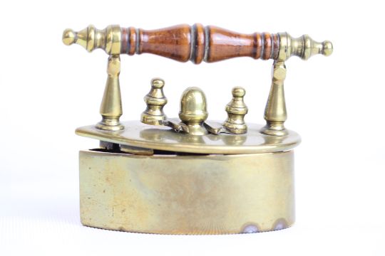 A miniature brass flat iron, turned wooden handle on baluster supports, held on hollow tear shaped body with swivel catch
