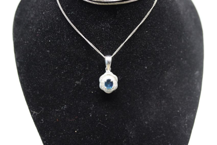 14ct White gold pendant set with baguette diamonds & central sapphire on 9ct white gold chain Weight 2.5g