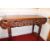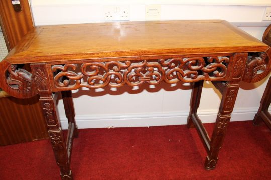 A pair of Chinese hardwood altar tables, each with rectangular top and rounded ends, the apron pierced and carved with scrolling interlace, raised on square legs with floral panels and stretchers. 1 table A.F