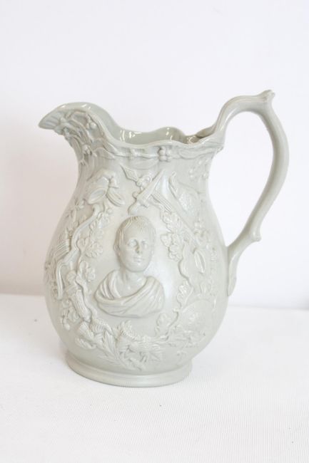 Sir Walter Scott, 1771-1832. A rare 19th century English glazed stoneware jug ‘Waverley Jug’, moulded in high relief. Possibly by Minton & Co. For a similar example: British Museum, accession number: 2009,8049.36.