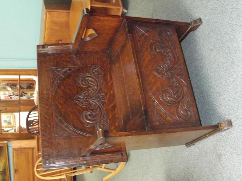 Early 20th century metamorphic oak Monks' bench with carved detail, height 88cm