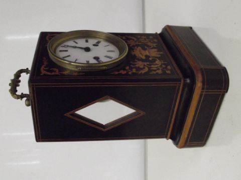 19th century French marquetry inlaid mantel clock by Raingo Frères of Paris, brass carry handle and brass movement striking on a bell, white enamel dial with Roman numerals, diamond shaped glazed sides and glazed aperture to top, height 26cm inclusive of handle