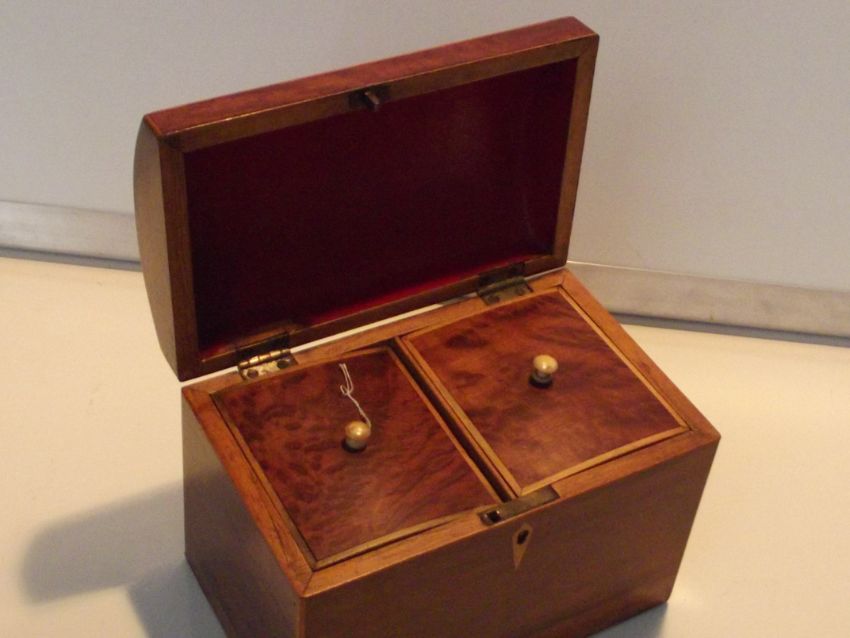 19th century mahogany tea caddy, hinged domed lid enclosing two compartments
