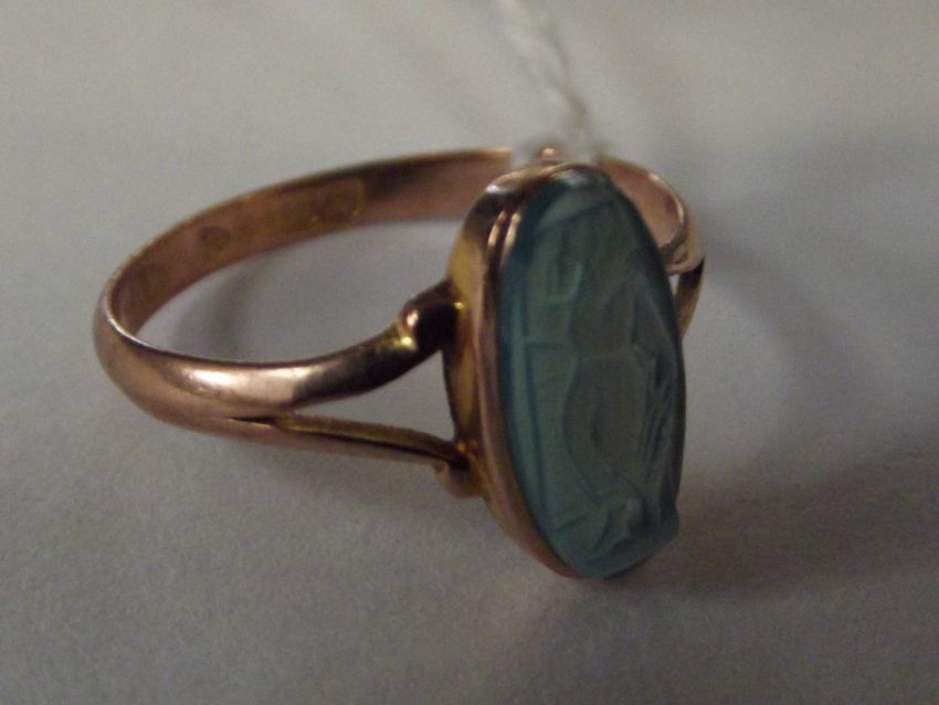 9 carat rose gold dress ring with carved blue stone, Chester hallmark, size P