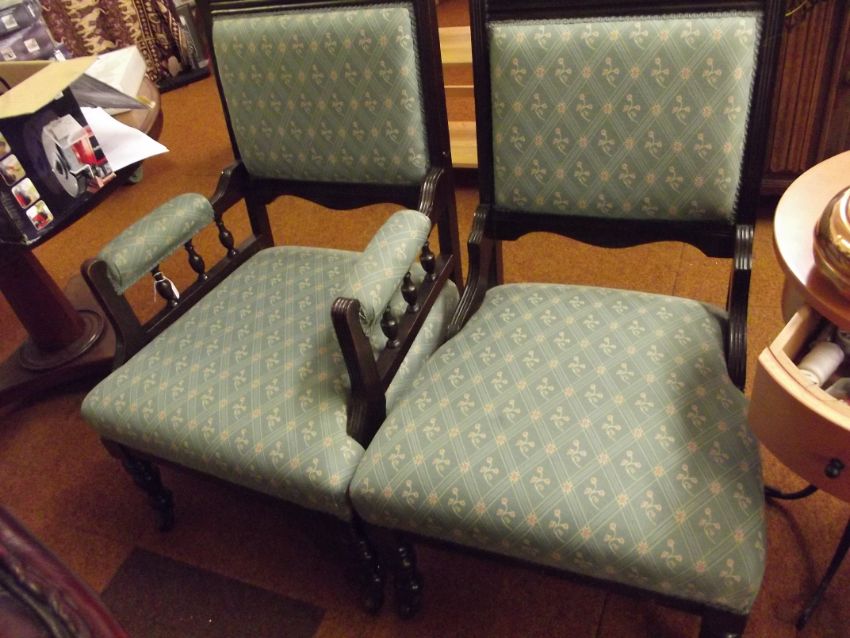 Pair of late Victorian lady's and gentleman's salon chairs, recently reupholstered to good effect