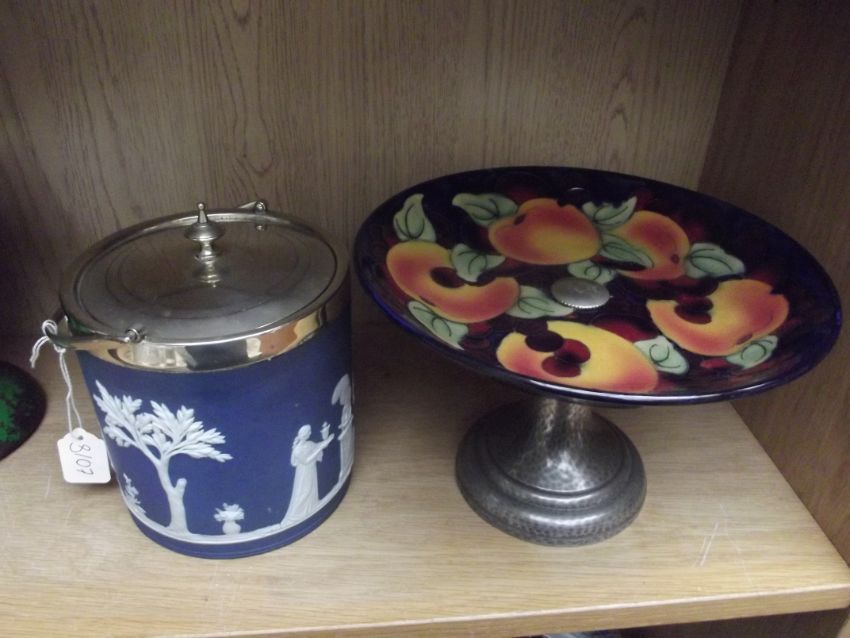 Wedgwood biscuit barrel together with a tubelined comport with pewter base