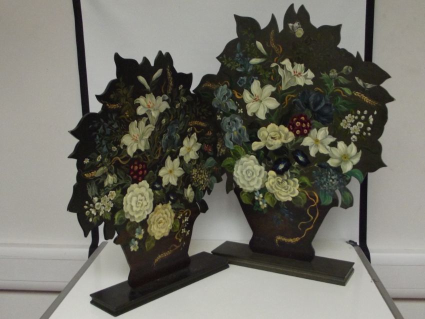 Two painted fire screens, largest 78cm
