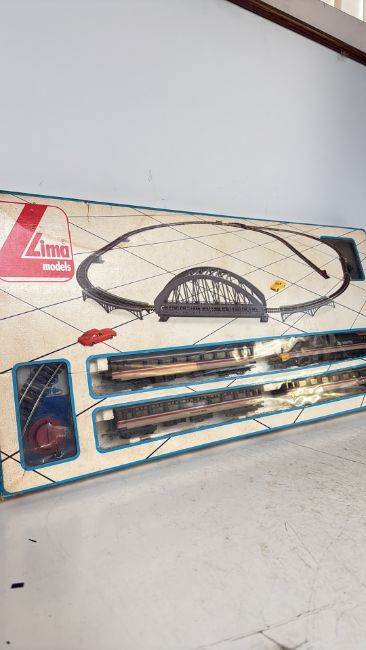 Lima Models vintage HO scale train set, featuring InterCity passenger coaches, track, bridge, and controller. Original packaging.
