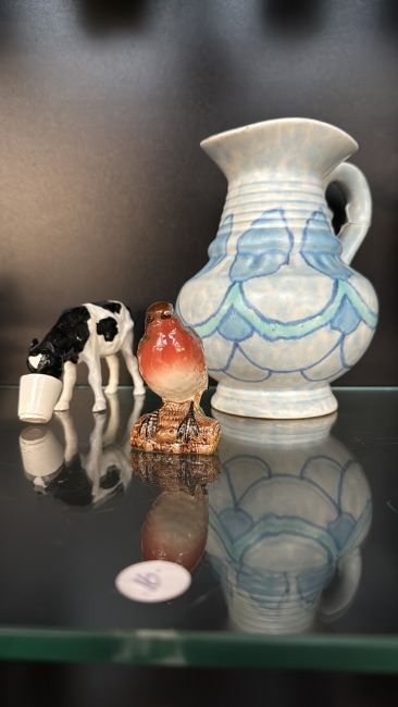 Hand-painted Shebeg porcelain cow by K.A. Mooney, Isle of Man, an artisan-glazed pottery jug, and a ceramic robin figurine.