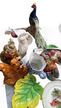Eclectic ceramic collection featuring clown, peacock, parrot, and meerkat figurines; decorated leaf platter and bird-themed plate.