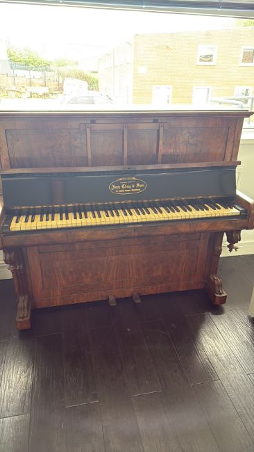 Isaac Thorp & Sons Victorian Upright PianoVictorian walnut-veneered upright piano by Isaac Thorp & Sons, 25 Church Street, Manchester, with cast iron frame, ivory keyboard and triple pedals, c.1880s.