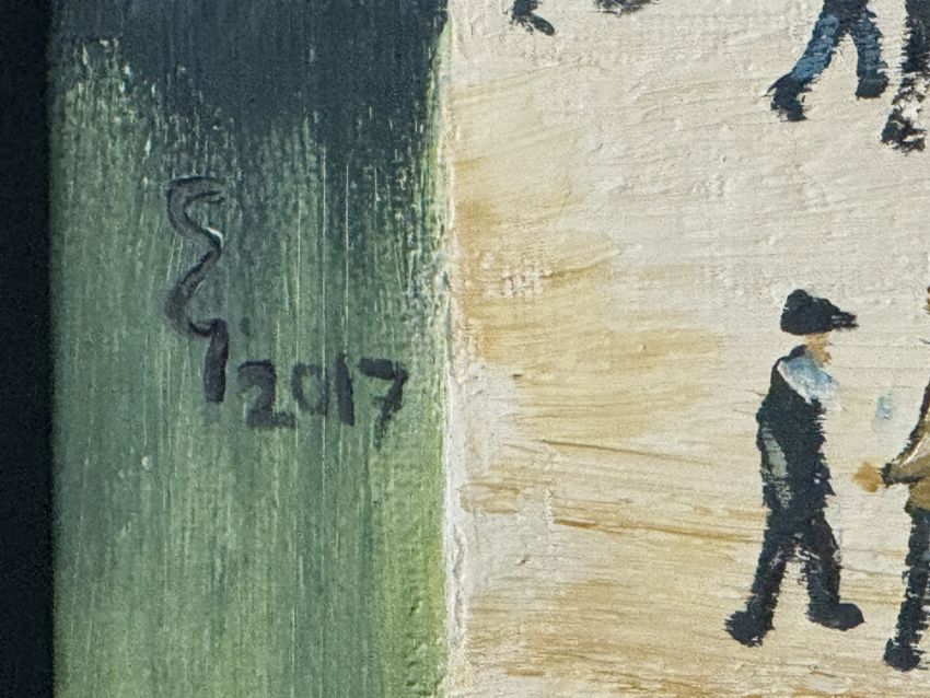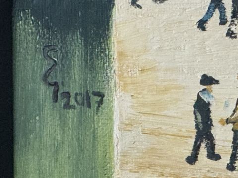 Shaun Greenhalgh: After Lawrence Stephen Lowry framed oil on canvas, signed and dated bottom left L S Lowry 1923. Titled "Going to the match" and dated to verso, Painted by Bolton Artist Shaun Greenhalgh b.1961 . Painted in 2017 - 62cm x 51cm including frame. Bottom left Shaun has left his symbol and date (Re sale from 2018)