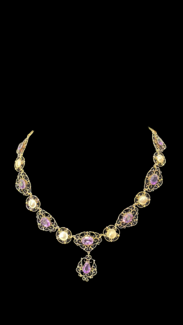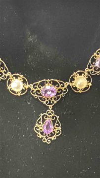 Yellow metal Edwardian necklace set with 12 amethyst & 11 pearls Total weight 31.2g