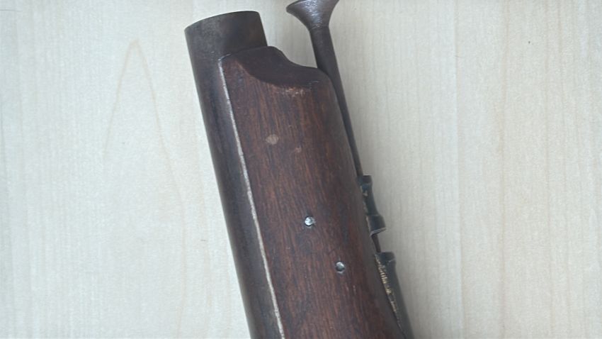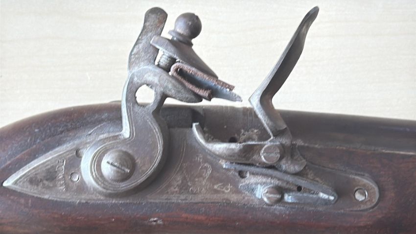 Early 19th-century flintlock tower napoleonic horse pistol Large smooth-bore flintlock pistol with walnut full stock, iron lockplate faintly stamped, brass butt cap, two brass ramrod pipes and original steel ramrod; Continental manufacture, circa 1800–1820.