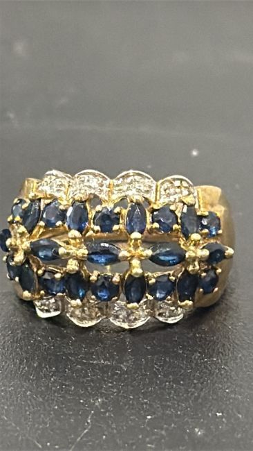 9ct Gold ring featuring an intricate design with blue sapphires and sparkling diamonds. Size N.5 Weight 4.7g