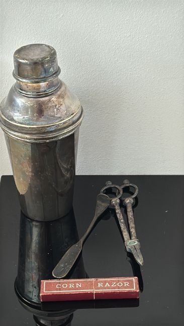 Vintage cocktail shaker, wick trimmers and grooming tools, 5 pcs