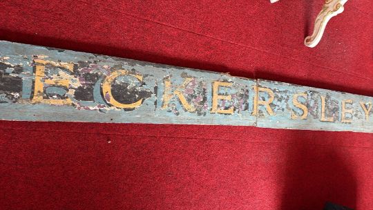 Hand-painted wooden shop sign: Bickersley Mens Wear