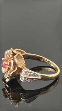 14ct Gold ring in the form of a flower, central garnet & chip diamonds on each shoulder Size N Weight 7.5g