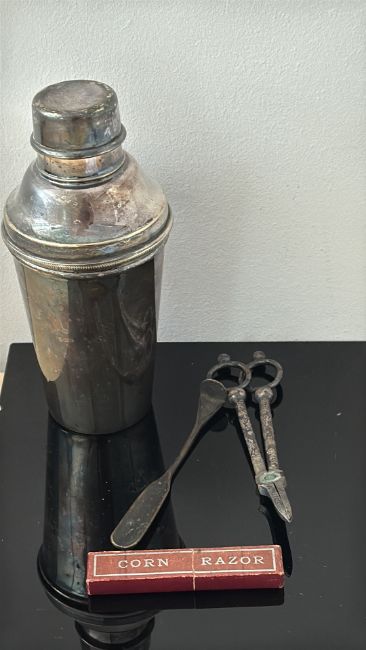 Vintage cocktail shaker, wick trimmers and grooming tools, 5 pcs