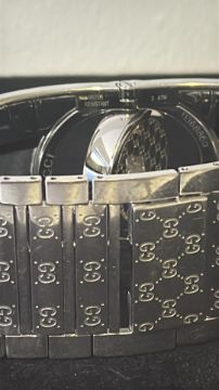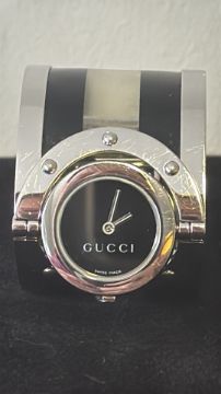 Gucci “Twirl” YA112 stainless-steel bangle wristwatch, black quartz dial, rotating bezel, interlocking G-pattern bracelet, Swiss made, water-resistant to 3 ATM. Not currently ticking, very clean condition, possibly requires a batter