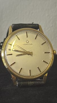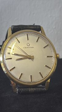 Certina Swiss manual-wind wristwatch, circa 1960s–70s, gold-plated round case, champagne dial with applied baton hour markers, centre seconds, on black leather strap. Currently ticking & keeping good time