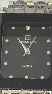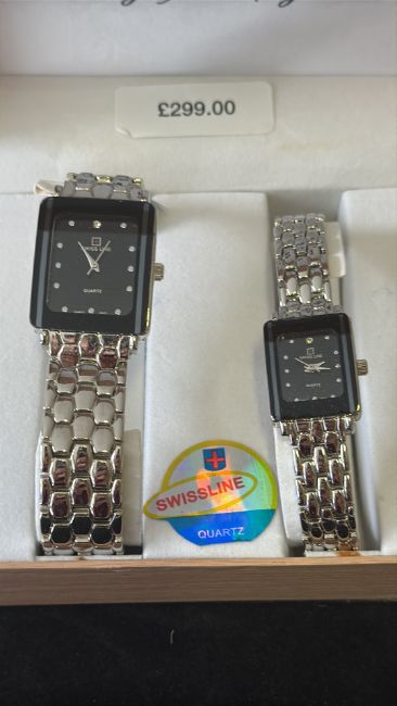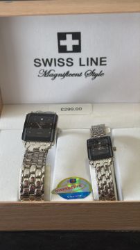 Presentation box containing matching Swiss Line quartz wristwatches, gents and ladies models, rectangular black dials with diamond-style indices, stainless steel link bracelets, in original wooden box. Ladies currently ticking, gents possibly requires a battery