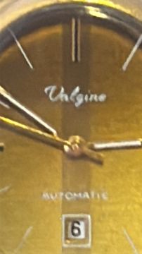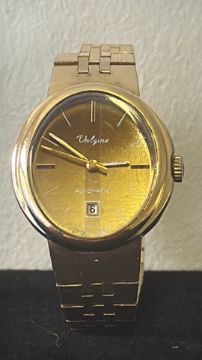 Valgine Swiss automatic wristwatch, gold-tone round case, champagne dial with baton indices, date aperture at 6 o’clock, integrated link bracelet, circa 1970s. Currently ticking
