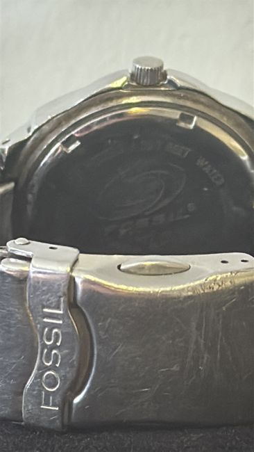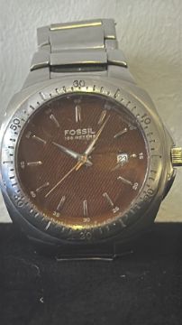 Stainless-steel quartz wristwatch by Fossil, brown textured dial with baton hour markers, date aperture at 3 o’clock, rotating bezel and signed bracelet, rated 100 m water resistant. Not currently ticking possibly requires a battery