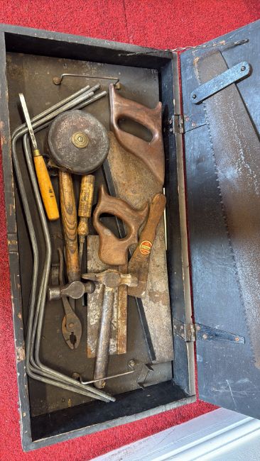 1930s wooden tool chest with assorted hand tools