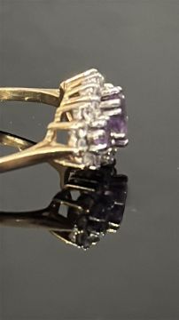 9ct Gold ring set with 3 amethyst surrounded by white stones Weight 2.4g Size S