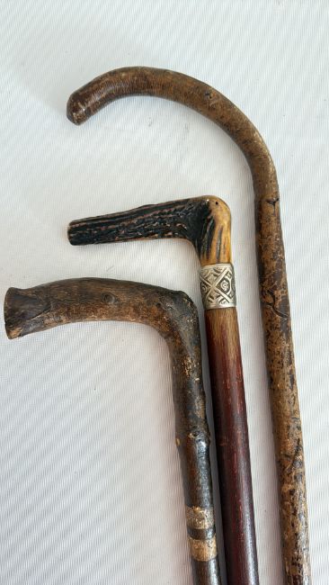 Group of three rustic wooden walking sticks
