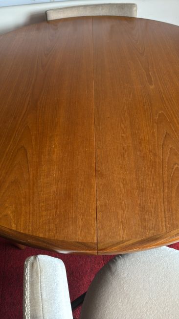 G-Plan Teak round extending dining table with four chairs, c.1960s
