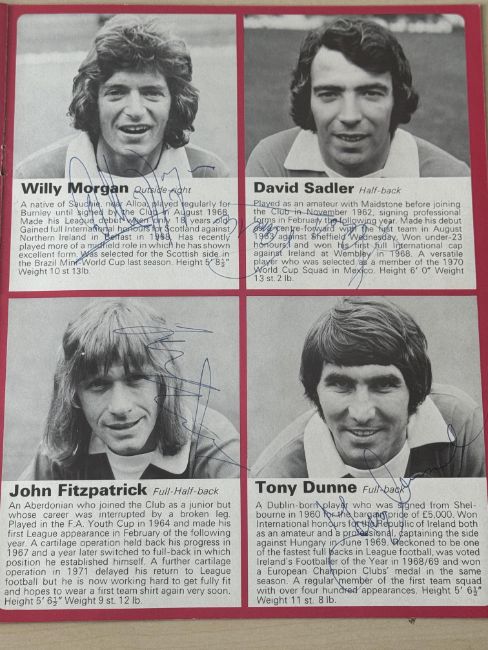 Introducing Manchester United 1972 - Very important signed football book. All signed photographs - Denis Law, Willie Morgan, Steve James, Tony Young, Brian Kidd, John Connaughton, John Fitzpatrick, David Sadler, Alex Stepney, Jimmy Rimmer, Tommy O'Neil, Ian Moore, Martin Buchan, Carlo Sartori, George Best, Sammy Mcllroy, Bobby Charlton & Tony Dunne. All signed with ballpoint pen, four signed by George Best & two signed by Bobby Charlton. Acquired personally by our client