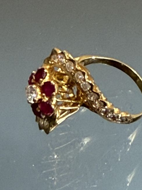 21ct Gold ring set with 21 diamonds & 6 rubies. Central diamond approx 3/8ct. Total diamond size approx 1.6 ct. Each ruby approx 1/8ct each. Total ruby 0.75 ct.