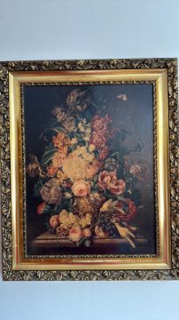 Still life oil painting with flowers, fruit and birds