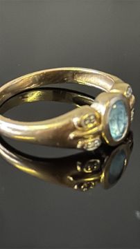 9ct God ring set with 4 diamonds & central aquamarine Weight 2.7g Size P.5