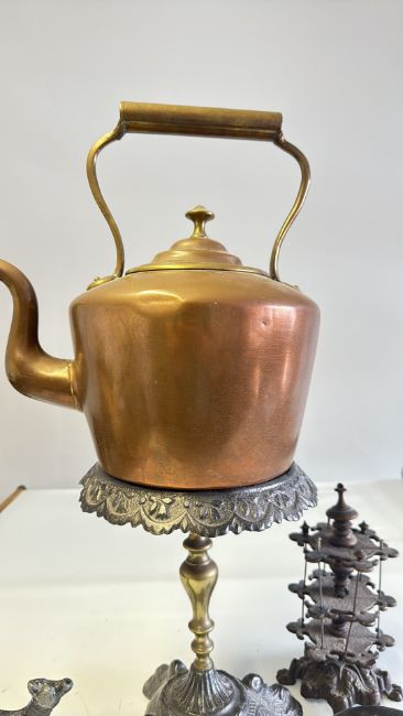 Group of copper kettle and cast-iron metalware, 5pcs