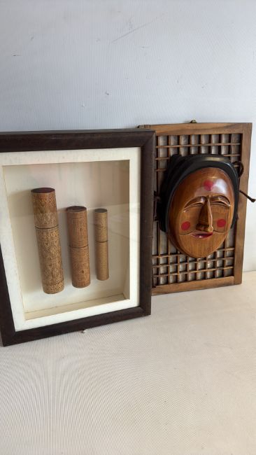 Framed Korean-style mask and carved bamboo cylinder display, pair