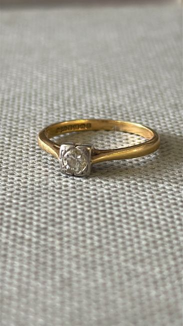 18ct Gold ring set with solitaire diamond ring set in a platinum mount Size P Weight 2.8g