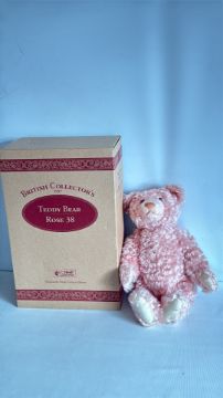 Steiff British Collector’s “Rose 38” teddy bear, 1997, pink mohair plush with brass-button ear tag, original carton and certificate.