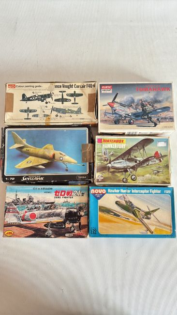 Group of 6 boxed 1/72 scale plastic aircraft model kits: Frog Corsair F4U-6, Academy P-40B Tomahawk, Starfix A-4F Skyhawk, Matchbox Hawker Fury, Japanese A6M2 Zero, Novo Hawker Hunter.