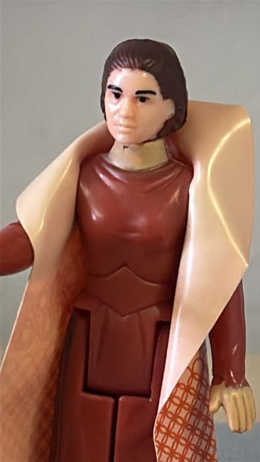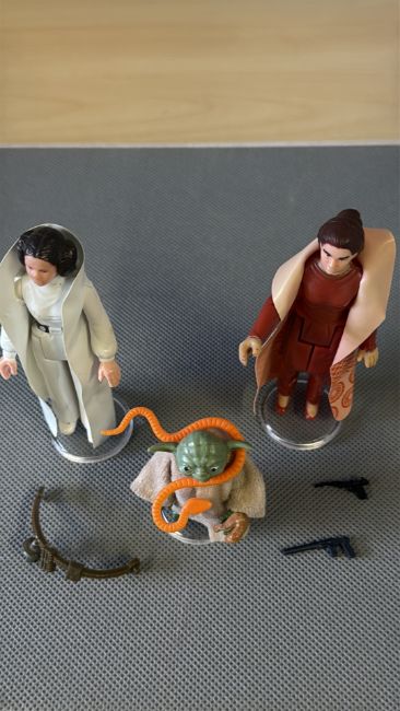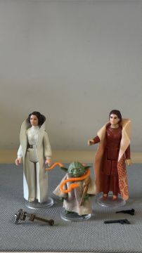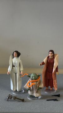 Group of 3 Kenner Star Wars 3.75-inch action figures: Princess Leia Organa with white vinyl cape, Princess Leia Organa in Bespin gown with patterned vinyl cape, and Yoda with orange serpent, cane and blasters.