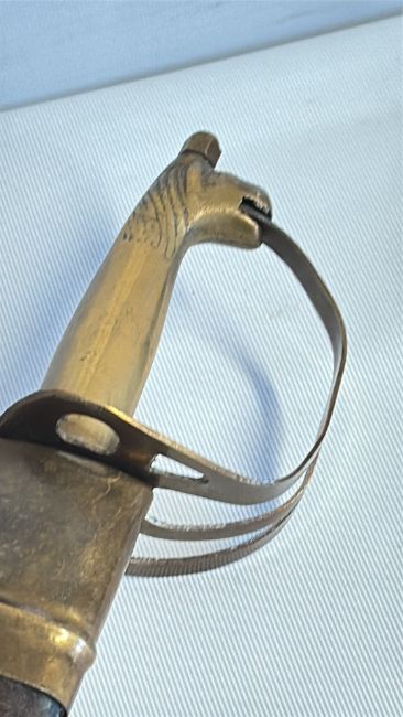 Curved steel cavalry sabre with three-bar brass guard, plain grip and leather-covered scabbard with brass mounts, late 19th century.