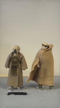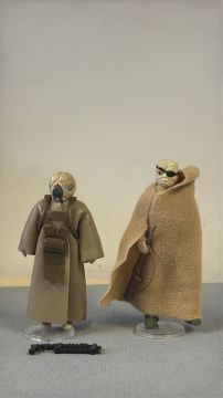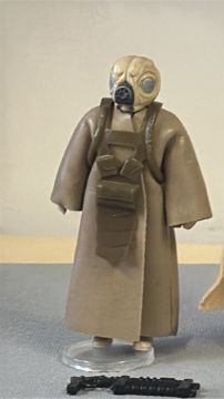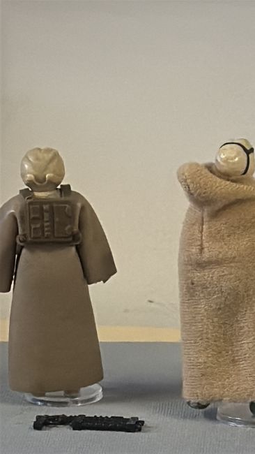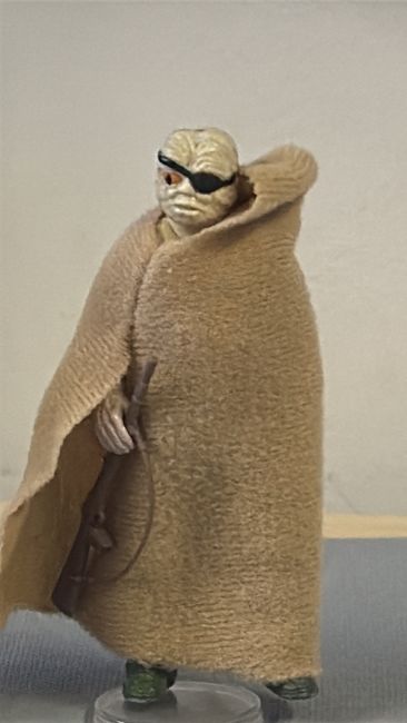 Pair of Kenner ‘Star Wars’ 3.75-inch action figures: Zuckuss (mis-carded 4-LOM) with backpack and blaster, and Prune Face with fabric cloak, staff and rifle accessory.