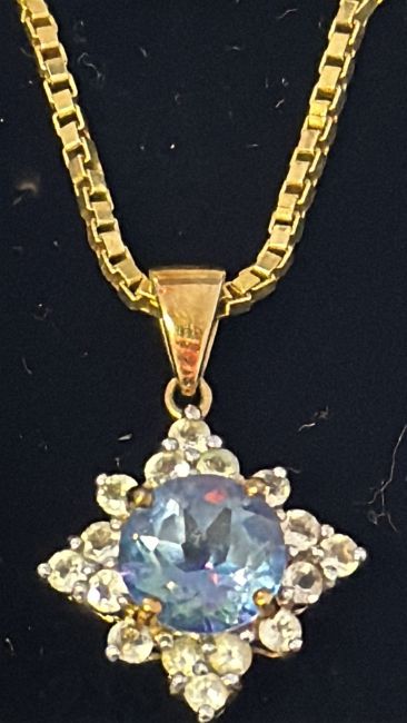 9ct Gold chain & pendant, Chain weight 2.03g. 9ct Gold pendant set with Neptune & white topaz