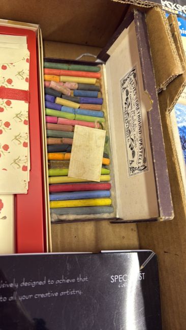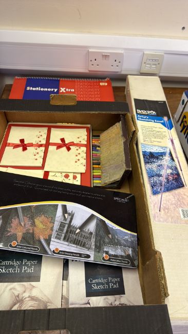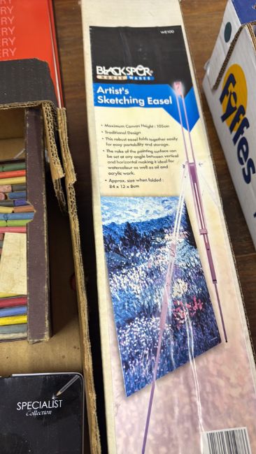 Group of art supplies with easel, pencils, pastels and sketch pads