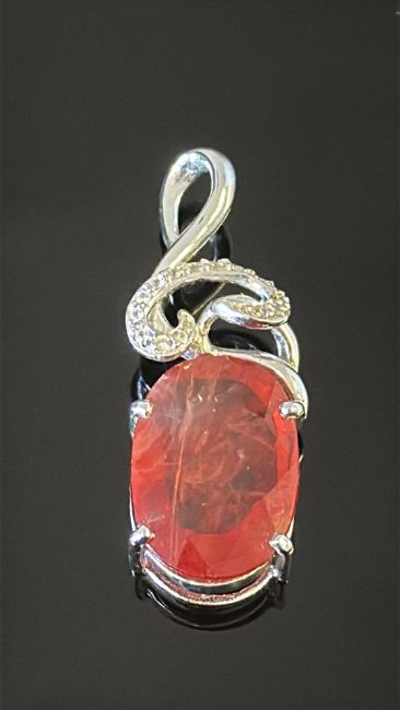 18K white gold pendant centring an oval mixed-cut padparadscha sapphire (c.19 × 13.5 mm, 13.56 ct) in four-claw mount, scrolling bale pavé-set with petite round white sapphires. Gold weigh - 5.80g