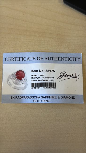 18ct white gold ring centring an oval Madagascar padparadscha sapphire of c.2.17 ct, claw-set within a diamond-set floral cluster gallery and tapering shoulders. Gold weigh - 4.97g